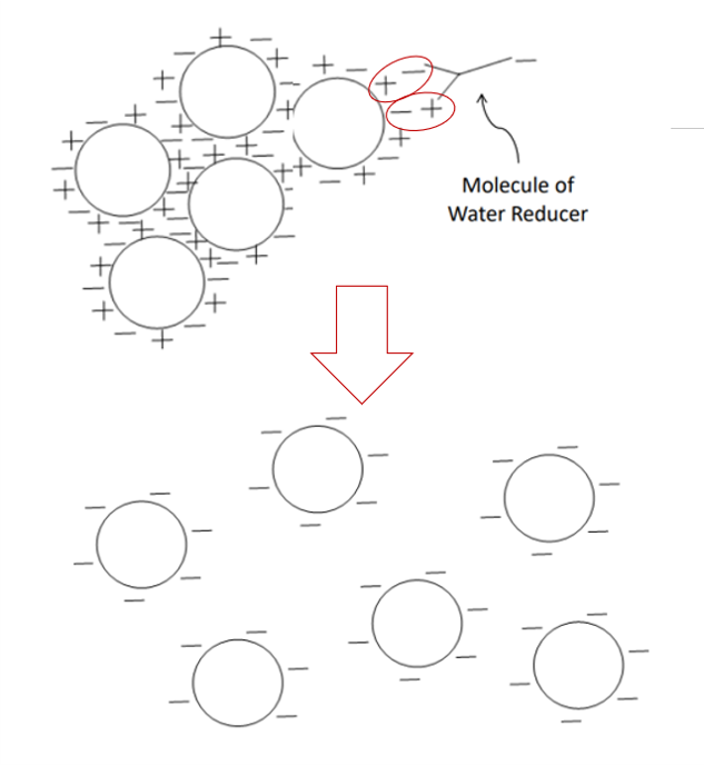 The water reducer molecule with 1 +VE and 2 -VE (you can also use water reducer whose molecule has 2 +VE ad 1 -VE, the effect is the same as a matter of fact) will combine with the positive and negative charges on the surface of the cement particles. So the extra - VE will be left on the surface of the cement particles, making the surface of the cement particles negatively charged so that the cement particles can repel each other.