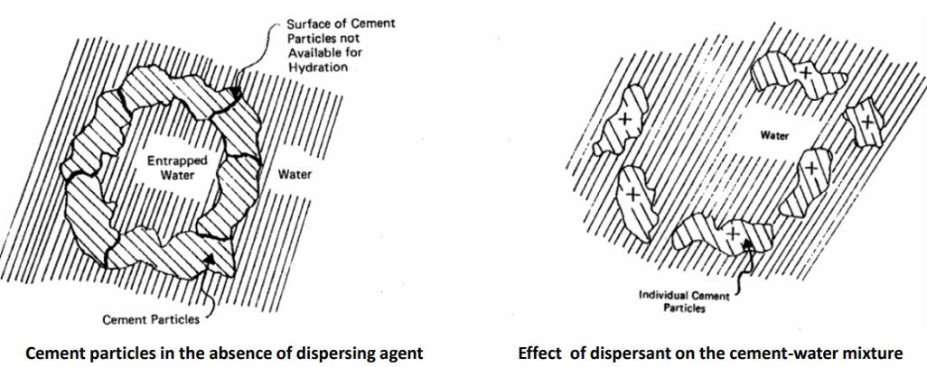 If the cement particles repel each other, the repulsion of like charges will push the cement grains apart so that the water trapped in the particles could release, increasing hydration and workability.(It is easy to understand, The release of trapped water means there’s more water available for hydration.)