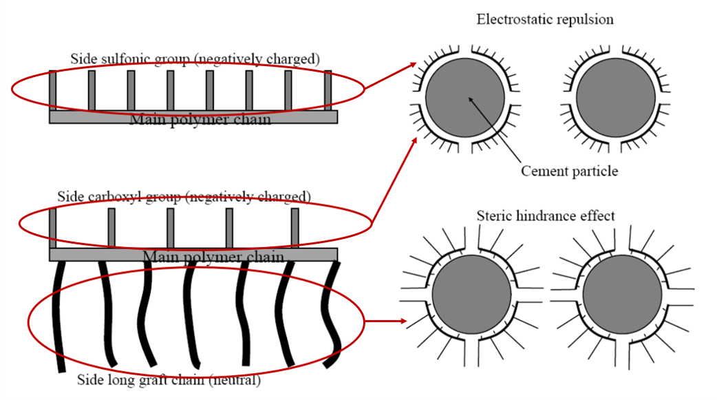 So how do superplasticizers work? They work the same way as water reducers, separating cement particles from each other to release water. But in addition to providing electrostatic repulsion, it can also separate particles by steric hindrance effect. On the sulfonated polymer and copolymer superplasticizers, for example, the electrostatic repulsion comes from the negatively charged side sulfonic group and side carboxyl group, both of which are attached on the main polymer chain. On the other hand, the steric hindrance effect comes from the neutral side long graft chain which is also attached on the main polymer chain. That`s the mechanics of superplasticizers.