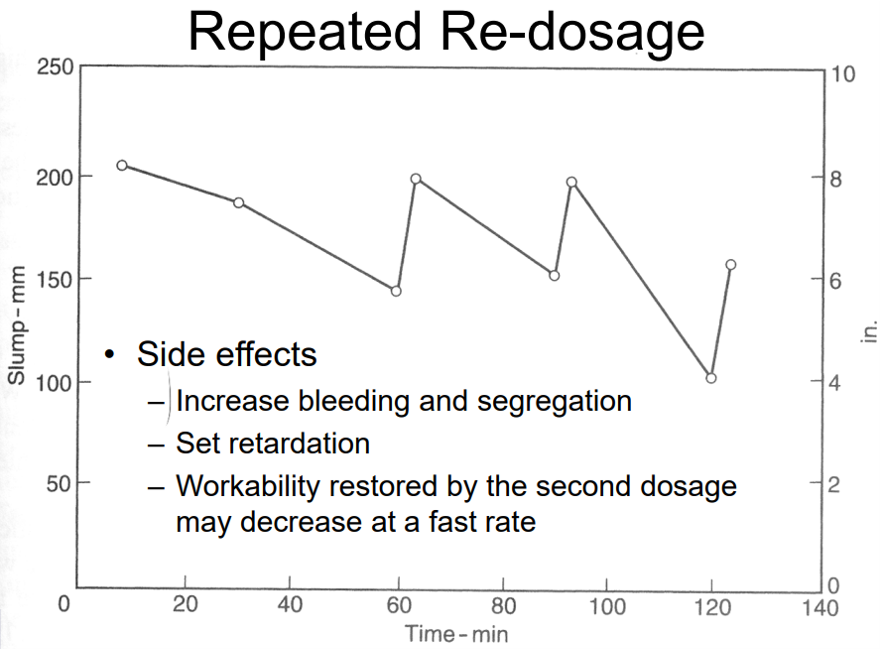 This figure shows the slope of Slump-Time curve for repeated re-dosage is getting higher ang higher, it means that the water reducing effect of SP becomes worse and worse with the number of times the water reducing agent is added. As for why we add more than once, it can be seen from the figure that the workability of cement decreases a lot only after the first 1h addition.