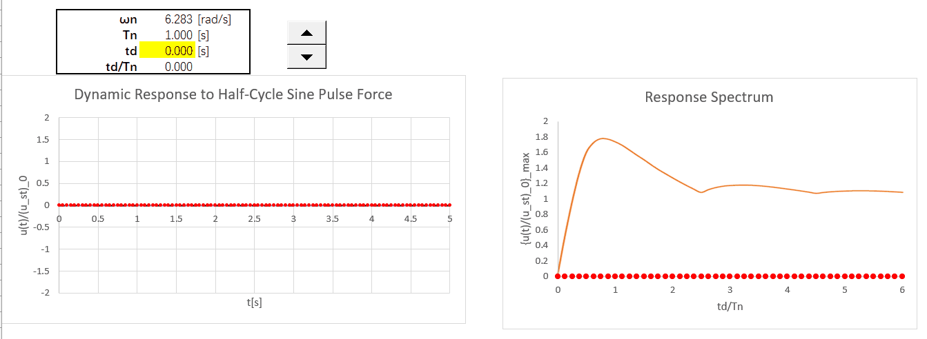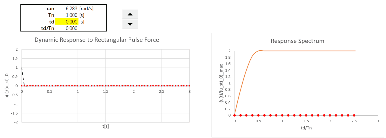 □If \(t_d<T_n/2\), the peak occurs at the end of the forced vibration phase, \(R_d = 1-cos(2\pi t_d/T_n)\).