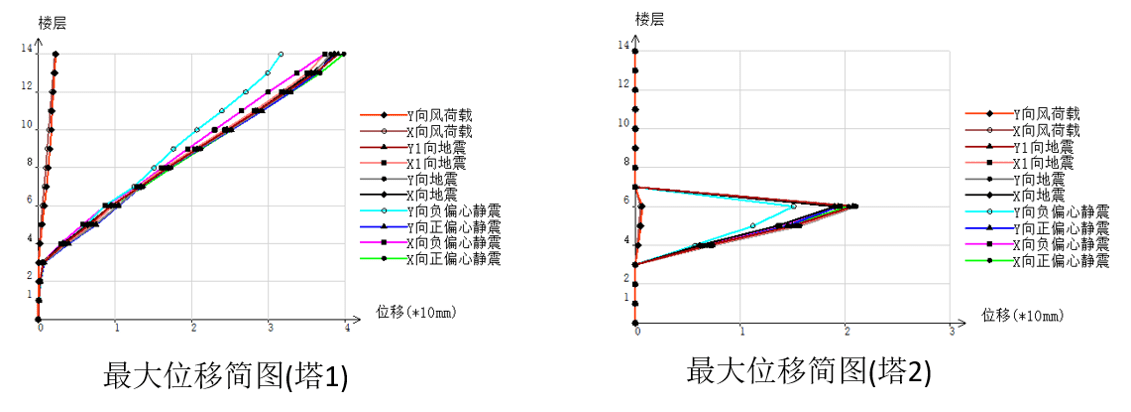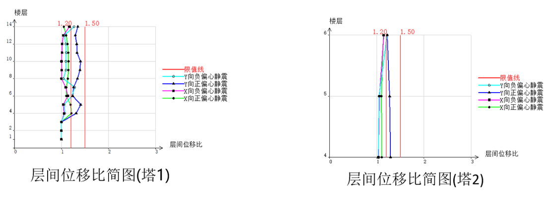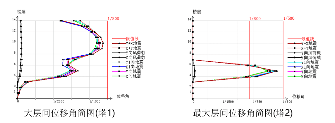 结构在L平面的长短肢端部及转角处变形幅度较大,相应位置发生最大层间位移角,指标均在可控范围内。周期比:T3/T1=0.775<0.90 满足规范要求。