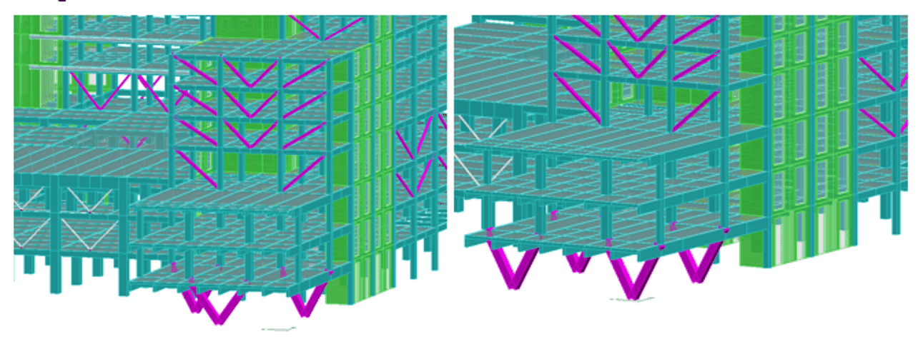 结构转角处抗侧刚度不足,双向层间位移角均较大,应在转角处外侧(邻街侧)布置剪力墙,但受限于地下室行车道与建筑立面形象的要求,仅在一处转角外侧布置剪力墙仍有不足,因此通过增加短肢Y向抗侧刚度、补加剪力墙,改善结构总指标。