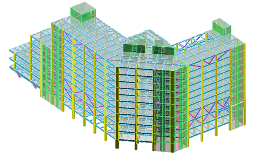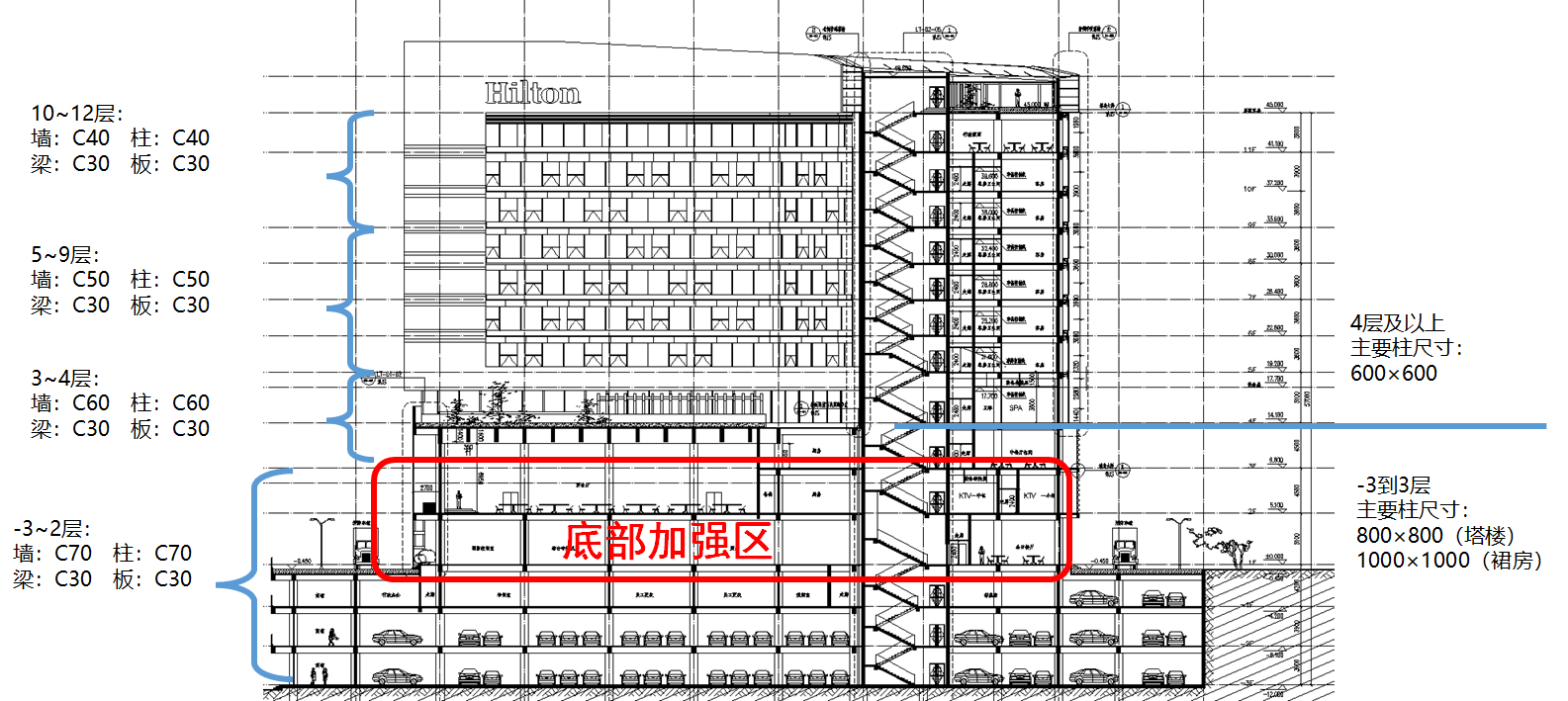 该项目建筑体型复杂,平面及竖向均存在不规则,但考虑到场地地基基础条件良好、设缝后周期比、位移角等技术指标更优、混凝土及用钢量较少,因此将结构划分为地下室大底盘及裙房、酒店分别组成的两座相对简单的结构单元,设缝宽度为100mm,满足规范最小要求,同时两侧框架柱的箍筋沿房屋全高加密,构造加强。