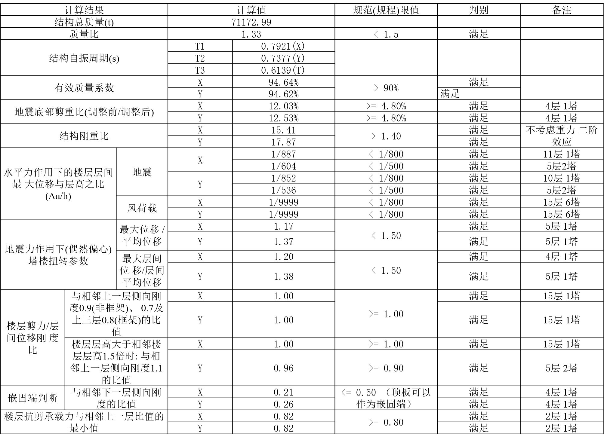 在X向静震工况下框架部分的倾覆力矩占比38.5%,剪力墙部分61.5%。在Y向静震工况下框架部分的倾覆力矩占比49.4%,剪力墙部分50.6%。框架部分承受的地震倾覆力矩介于总地震倾覆力矩的10%~50%之间,主楼按框架剪力墙结构设计是合理的。