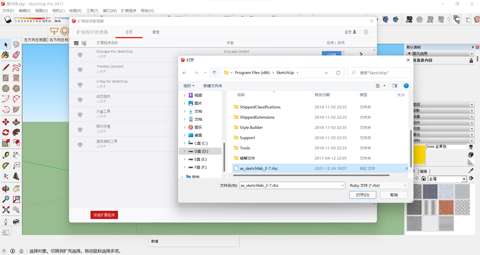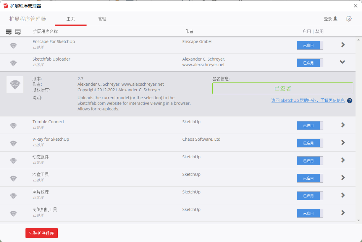 基本上是傻瓜式操作:下载rbz格式插件→窗口→扩展程序管理器→安装扩展程序。
