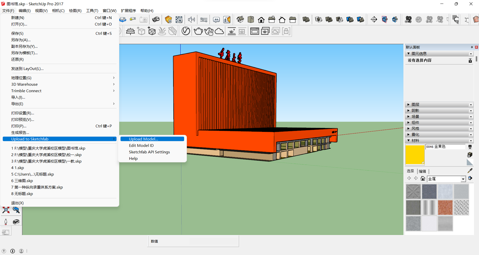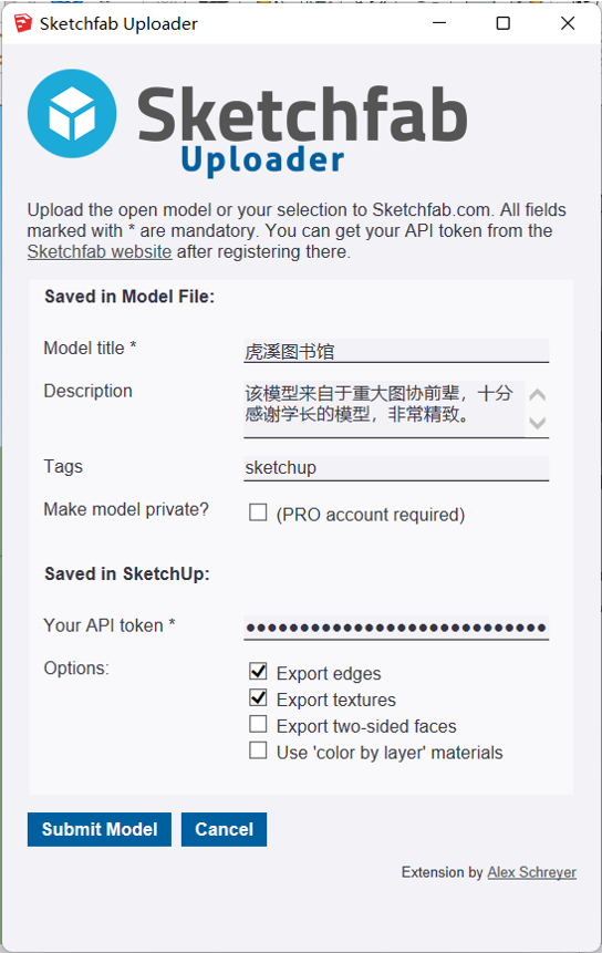 文件→Upload to Sketchfab→Upload Model→输入账号API(见Sketchfab个人信息)。