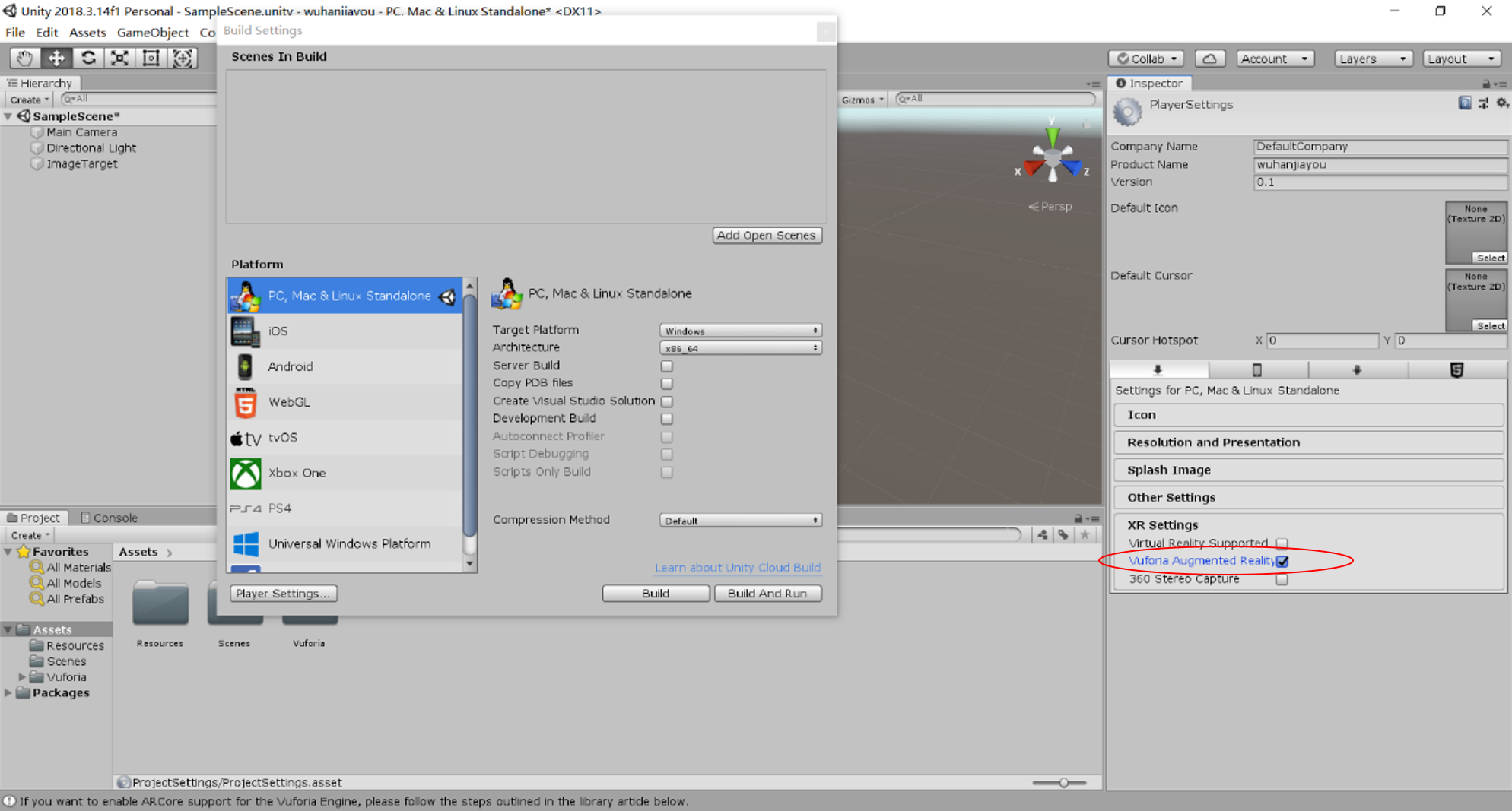 从File-BuildSettings-PlayerSettings,勾选Vuforia AR以激活引擎。
