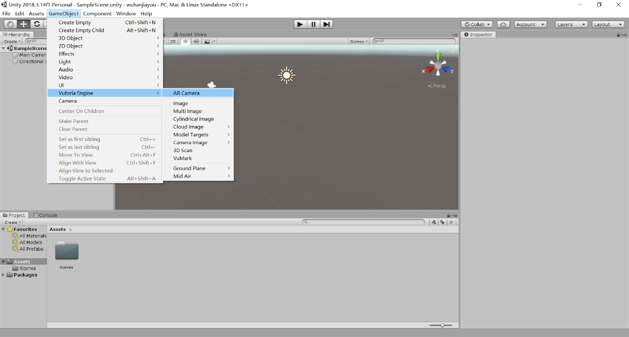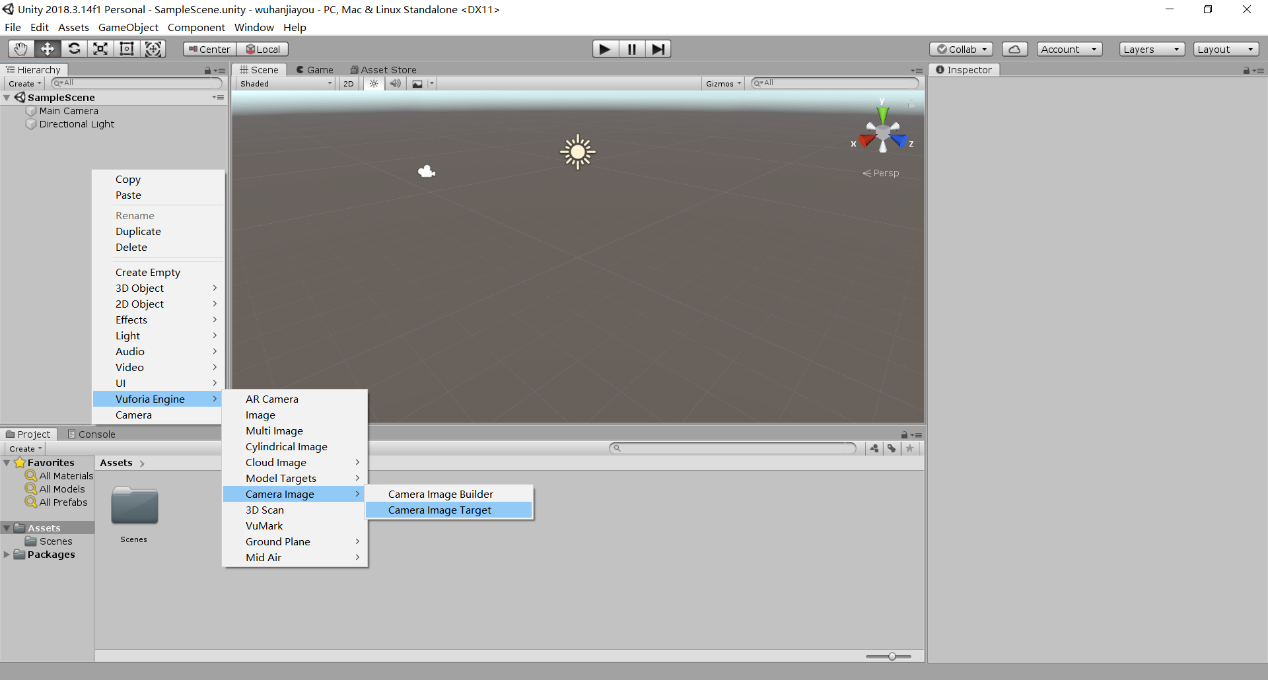默认场景中包含Main Camera、Directional Light,但并不包含Target,而我们要实现的是在特定目标上(明信片)展示3D模型,所以需要我们右键添加一个Target出来,我们要定位的明信片上的图片,所以添加Camera Image Target即可。