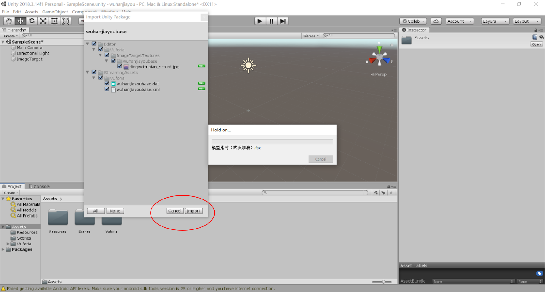 ②将定位数据包和3D模型(.fbx格式)拖入Assets,或者Import Unity Package。