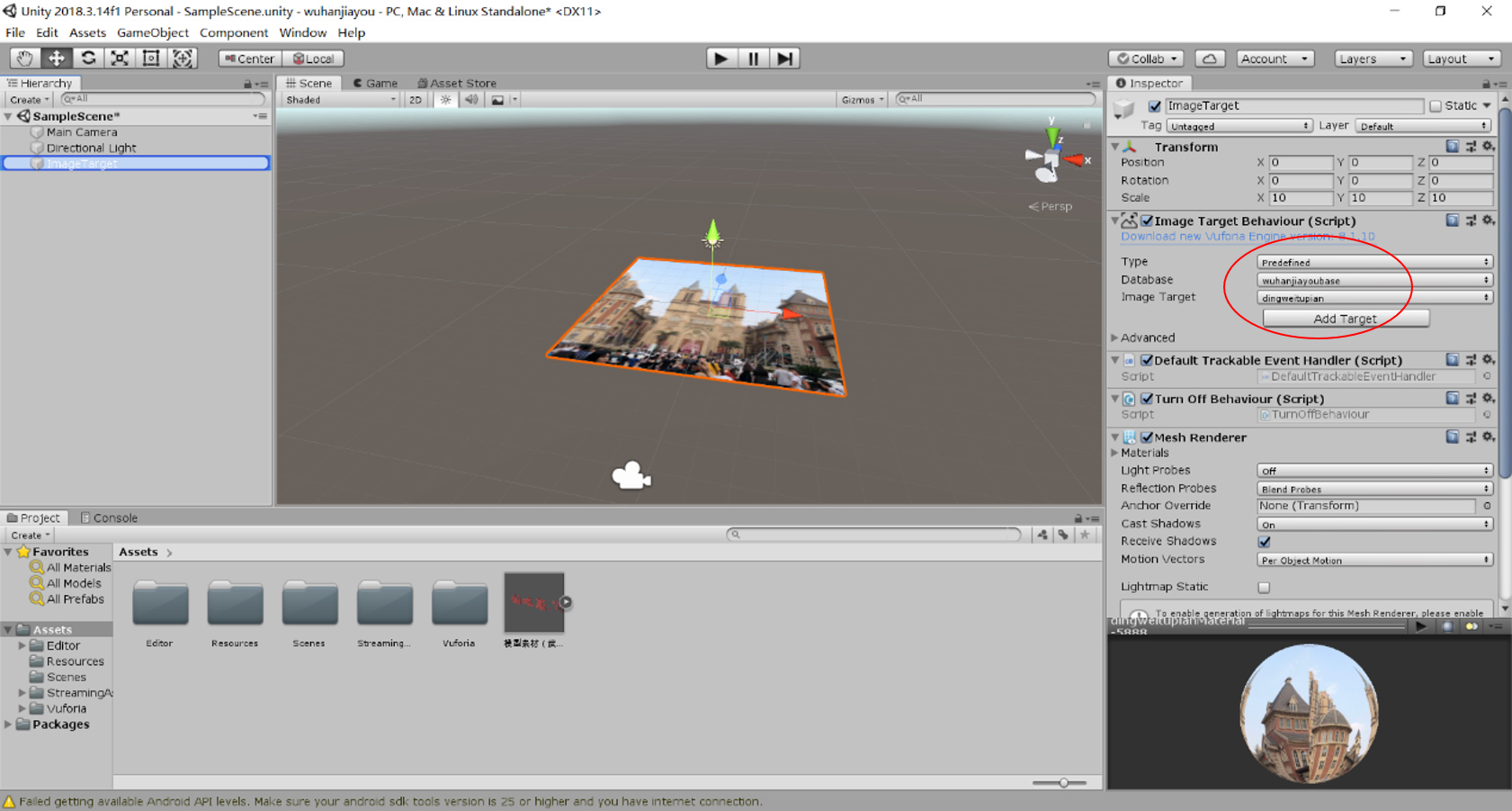 ④将场景目标和3D模型匹配:将Assets中的3D模型.fbx文件拖入Image Target子目录,适当调整参数。